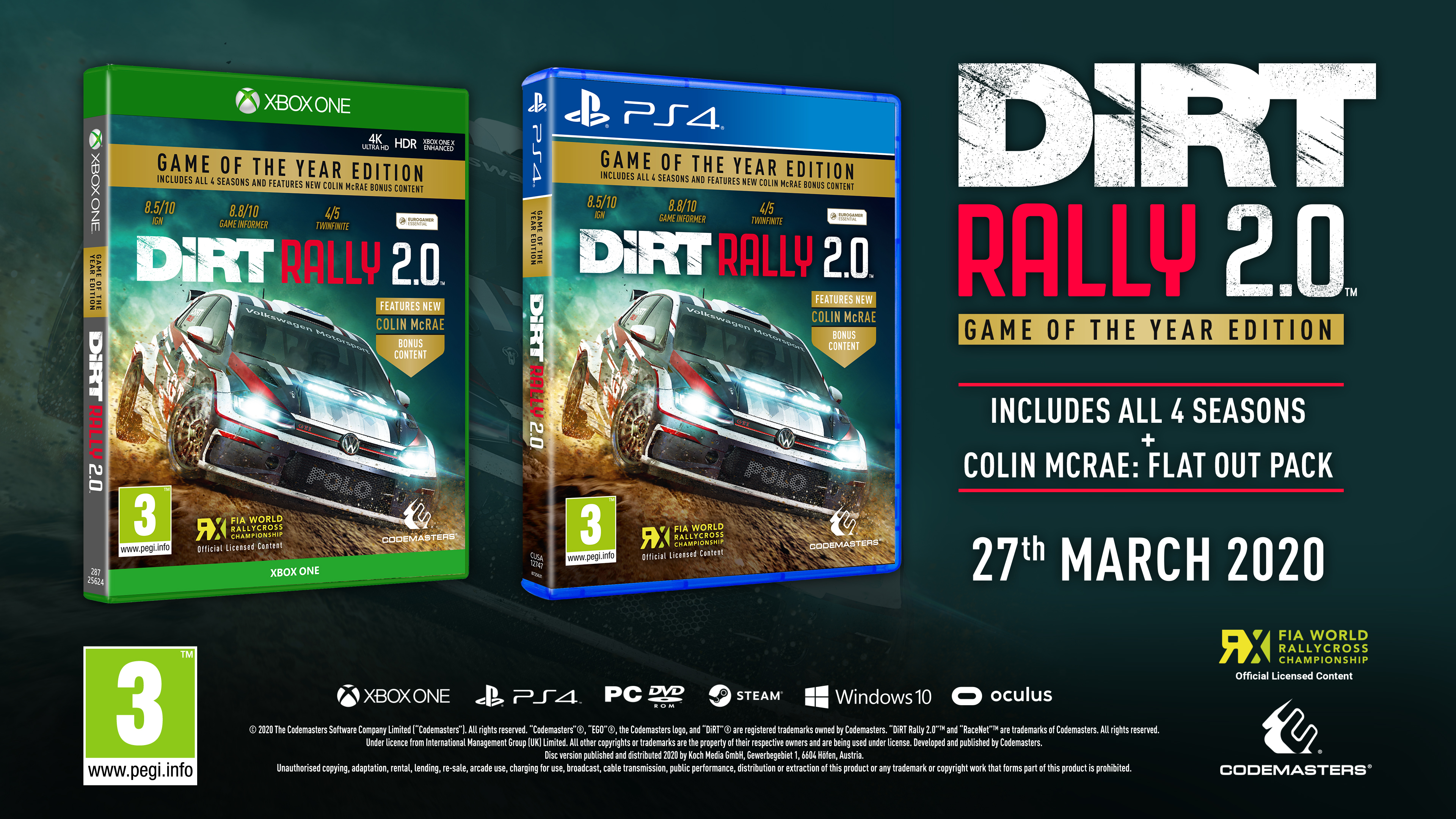Launching 27th March 2020 on PlayStation®4, Xbox One and PC, players receive the main game, Seasons 1-4 featuring a variety of vehicles, locations and liveries, and new bonus content celebrating the career and achievements of Colin McRae. Players who have previously purchased either DiRT Rally 2.0 Deluxe Edition or any full Season pack receive the Colin McRae bonus content for free as a digital download from 24th March.